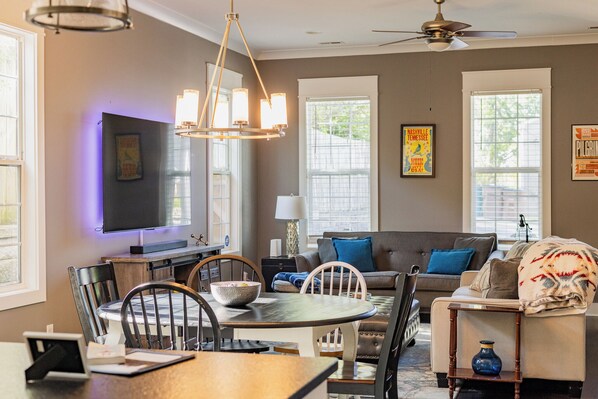 Built for group trips, bachelorette weekends, and family getaways. With 6 comfortable beds, 3 full bathrooms (no waiting to get ready!), walk-in closets, and spacious common areas, everyone stays together in comfort. Located in vibrant East Nashville, just minutes to Broadway, restaurants, breweries, and live music. Free parking + pet friendly.
