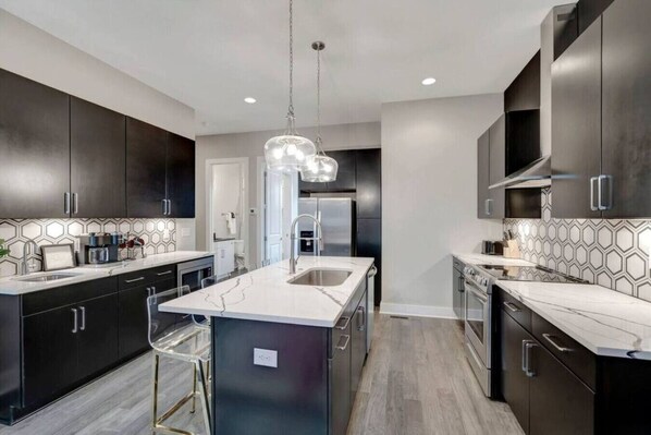 Two full townhomes side-by-side — ideal for big groups, corporate stays, family gatherings, or bachelor/bachelorette weekends. 8 spacious bedrooms + 8 full bathrooms, each beautifully designed with comfort and privacy in mind. Rooftop decks with sweeping downtown Nashville views. Open-concept living areas with modern décor and plenty of seating for everyone. WiFi, and keyless entry for a seamless stay. Sleeps up to 24 guests comfortably Located just minutes from Broadway, The Gulch, and 12South