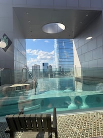 A seasonal outdoor pool and an indoor pool, along with cabanas