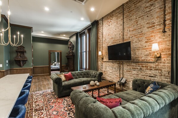 Welcome to the legendary Southern Turf Building in the heart of downtown Nashville, Tennessee! Nestled just above historic Skull's Rainbow Room (a Nashville landmark since 1948) and Nashville's newest and most elevated dining experience, Sinatra Bar & Lounge, we are thrilled to offer you a unique Airbnb experience with our six exquisite lofts that showcase the rich history and vibrant culture of this iconic city. Relax in comfort and indulge in the history and charm of the historic Southern Turf Building. Each of our lofts has been meticulously renovated by Icon Entertainment & Hospitality to provide a custom guest experience. The legendary Southern Turf Building holds a special place in Nashville's history, dating back to its construction in the late 19th century. Over the years, it has been a gathering place for locals and visitors alike, hosting vibrant music performances, lively events and unforgettable moments. Now, as part of Icon Entertainment's vision, these units combine the building's storied past with modern amenities and luxurious touches. We strive to provide you with an unforgettable stay, where you can immerse yourself in the soulful rhythms of Music City while enjoying the comfort and convenience of our thoughtfully designed accommodations. As our guest, you'll have access to all the amenities you need, including high-speed Wi-Fi, air conditioning, essential toiletries and a concierge service ready to assist you throughout your stay. All our lofts feature antique accents and select furnishings from the 1800's as an homage to the heritage of the Southern Turf Building. There's no limit to the live entertainment and delectable cuisine located not just in walking distance but within the same historic building as the lofts. The first floor is home to the Manhattan meets Palm Springs ambiance of Sinatra Bar & Lounge, a homage to Frank Sinatra serving classic Italian, prime steaks and classic cocktails. Head to the basement of the Southern Turf Building to experience the fine dining, craft cocktails and live entertainment (featuring live jazz nightly and burlesque performances every weekend) that has made Skull's the cornerstone of Nashville's historic Printers Alley district since 1948. Come experience the magic of Nashville from the legendary Southern Turf Building, where history, music and hospitality converge.