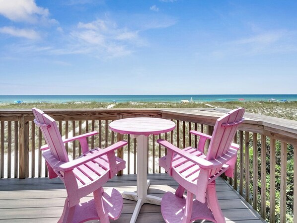Relax and unwind while taking in the amazing views this beautiful, end-unit townhome has to offer! The main level features a large living area with a big screen TV in the living room, plenty of seating at the table and bar area and a nice sized kitchen with granite countertops. There is a laundry room and bathroom located off the kitchen which then leads into the downstairs bedroom. The downstairs bedroom is equipped with a king bed and a pull-out sofa. Upstairs you will find the second bedroom which also features a queen bed and pull-out sofa as well as a private bathroom. The large Master bedroom features incredible views of the Gulf as well as it's own private balcony. The Master bath features granite countertops and tons of counter space. On the main level there is a large, newly renovated balcony with breathtaking views. There are also stairs leading directly to the beach from the balcony. The lower level features a nice deck and an outdoor shower. If you are looking for that laid back, beachy vibe then this is it! Guest will need to bring streaming device for 2nd and 3rd bedroom Tv's. No smoking or pets allowed. Amenities Include: - Bed Size 1st/Master: King - Bed Size 2nd Rm: Queen - Bed Size 3rd Rm: Queen - Sofa Bed: Yes - Sleeps: 10 - Internet Access: Yes - Washer/Dryer: Yes - BBQ Grill: Gas - Kitchen: Full - Beachfront: Yes - Oceanfront: Yes - Beach view: Yes ...