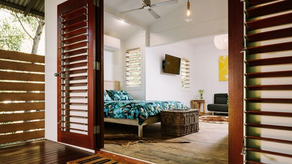 A large scale sliding door is a feature of the open plan interior slide it one way to completely cover the kitchen or the other to separate the bedroom from the living area. Open up your louvered doors to expand your living space to include your front and rear decks. Take a relaxing bath in the external bathtub housed on the back deck or spend some time under the rain shower in the spacious and sleek bathroom. Little Bush Hut is perfect for couples who appreciate seclusion and luxury.