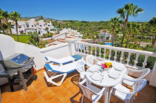 The apartment is Ideal for couples. Private sun bathing. 3 swimming pools. Excellent views of the tropical gardens. A 25 minute walk into Nerja for all shopping and restaurants / coffee shops. Only 15 minute walk to Mercadona supermarket. No need for a car and local bus service and taxis available. Kitchen and Patio great for alfresco dinning, but some great restaurants in Nerja - el Ninos, La Bottega and Vitaliano da Christina all highly recommended.
