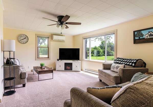 Acre off the Lake offers a perfect family getaway in Michigan's scenic landscape. Guests can relax on the furnished patio with a firetable, gather around the campfire, and cook in the well-equipped kitchen. The three bedrooms and spacious living areas ensure comfort for all.