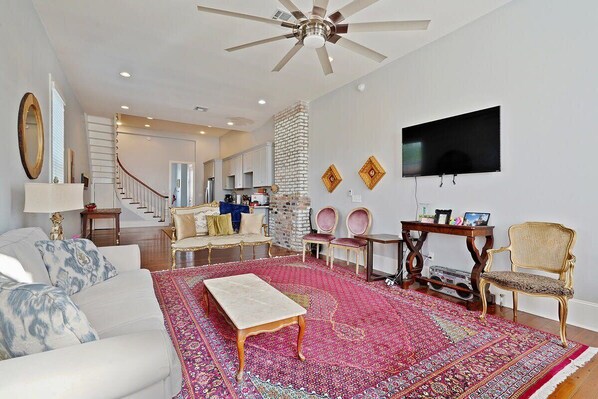 This brand new renovation of a 150-year-old bargeboard New Orleans home offers a stunning vacation experience. With amazing antique furnishings, sparkling wood floors, and a beautiful mural by local artist "Flashy Ken", this property is the perfect place to stay during your trip to the city. Guests will have access to four bedrooms, two full baths, a fully equipped kitchen, laundry facilities, parking, and a backyard area, making it a convenient and comfortable home away from home.