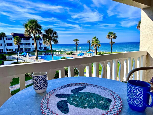 Outdoor dining - Bridget's Beach Retreat, On the beach with views on balcony,bedroom,living room (New Smyrna Beach)
