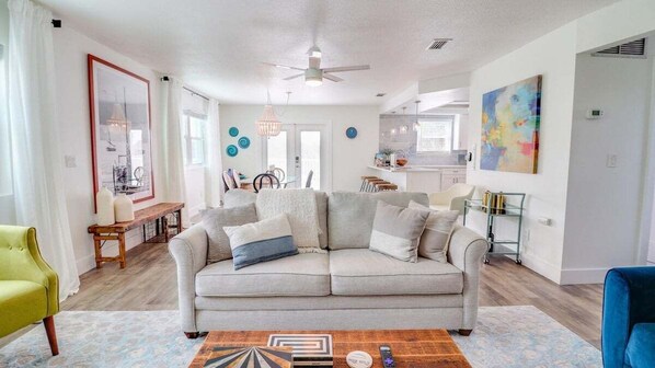 Deja Blue is a charming 3-bedroom, 3.5-bathroom beachfront retreat in New Smyrna Beach, perfect for a family getaway of up to 10 guests. This home exudes a cozy yet elegant ambiance with its blend of eclectic warmth and seaside luxury. As you step inside, you'll be greeted by an artistic interior, featuring light walls, vibrant blues and greens, and tasteful wood accents.
