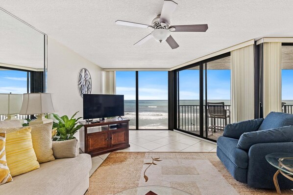 Beautifully renovated 2 bedroom 2 bath direct oceanfront condo. South Building. Enjoy the private oceanfront balcony and river views. Watch the waves roll upon the shore from the oceanfront living room featuring a TV, DVD, recliner, and queen sofa sleeper. Prepare your favorite seaside dish with a view of the ocean from the fully equipped kitchen with granite countertops. Delight in time spent with family in friends around the oceanfront dining room table featuring seating for 6 with additional seating for 3 at the kitchen counter. Spacious, river view master bedroom featuring a king-size bed and private bath with walk-in shower. The 2nd bedroom features 2 twins and a view of the river. The 2nd bath has a tub/shower. Full-size washer/dryer. Wireless internet access. Beach chairs and umbrellas.