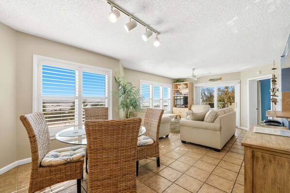 The perfectly appointed living room features a leather sofa, loveseat, cozy chair, flat screen TV, DVD, views of the ocean, and sliders to the private lanai. There is a fully equipped kitchen with everything you'll need to prepare your favorite seaside dish. Meals with a view of the ocean can be enjoyed in the dining room features seating for 4 with additional seating for 2 at the kitchen counter.