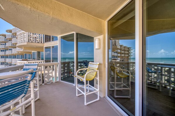Wake up every morning as you watch the dolphins play in the waves from the oceanfront master bedroom featuring a king-size bed, flat screen TV, and full bath with tub/shower and separate vanity so one can shower while the other prepares for a fun-filled day around town. Step out the sliders from the master bedroom and enjoy your morning cup of coffee as your watch the sun rise over the ocean. The 2nd bedroom, perfect for those traveling with children or additional guests, features two twin-size beds. The 2nd full bath, located in the hallway, features a walk-in shower and is perfect for washing the sand from your toes.