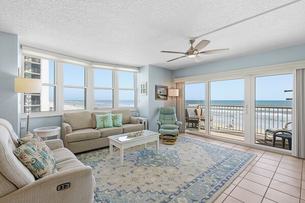 Unlike most units in the complex, this condo has a wrap-around view of New Smyrna Beach thanks to its corner location. Stretch out on either the pull-out couch or reclining sofa and watch the waves ebb back and forth in the distance. You'll find the living room provides a 45" Smart TV equipped with cable and streaming service apps.