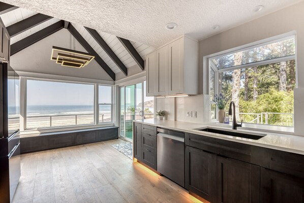 The kitchen is FULLY LOADED with every single gadget you could think of accompanied by top of the line stainless steel appliances and high end cookware. Enjoy ocean front dining in your own space.