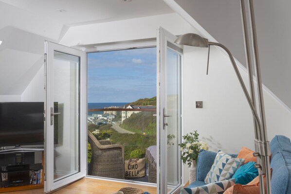 The spacious open plan interior at Number 10 includes a sumptuous living area with large sink-in sofas and French doors that lead out to a perfectly proportioned furnished balcony. Here you'll discover your own blissful sanctuary from which to enjoy spectacular sunsets and all the changing moods of the ocean beyond. Relish evenings curled up together in front of the fireplace or whip up a wonderful home cooked family meal which can be shared, along with anecdotes about the day's activities, around the large dining table. The sleek kitchen complete with integrated appliances and a breakfast bar with seating has been designed with socialising in mind, inviting chats over morning coffees or for enjoying a glass of bubbly while dinner is prepared. The two gorgeous bedrooms and two bathrooms including an en-suite master and a spacious twin, provide ample room for four. Underfloor heating and crisp, high quality linens provide a calm retreat that invites a great night's sleep and languid lie-ins leaving guests feeling well-rested and thoroughly refreshed.