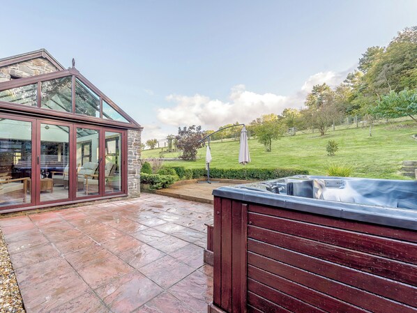 Bathroom: Bath, Cubicle Shower, Heated Towel Rail, Toilet. Oil central heating by oil rayburn, electricity, bed linen, towels, Wi-Fi and logs for wood burner included. Welcome pack. Enclosed lawned garden with patio, garden furniture and BBQ. Hot tub for 6 (private). Bike store. Private parking for 5 cars. No smoking.. This lovely, large detached property, situated next to a chicken farm, is just 4 miles from the town of Newtown yet sat in a rural location with great views of the rolling countryside. This property is an ideal base for groups of friends and large family gatherings. It comprises of an open plan kitchen/dining room which leads into a large conservatory, great for watching the wildlife in the area as it opens onto the large lawned garden and patio area, which hosts the private hot tub. The living room has a wood burner and again some fabulous views of the countryside. This room leads into the cinema room which boasts a 60" screen - great for movie nights! Upstairs there are four bedrooms, two doubles with en-suite facilities and two further twin bedrooms sharing a family bathroom. There is also a games room on the ground floor of the property. Plenty of walks can be had from the property so this is a great place for taking your four legged friends too. There is so much to do and see in the town of Newtown, with its array of shops, coffee shops and restaurants, and the coast is a short drive away. Shop, pub and restaurant 4 miles.