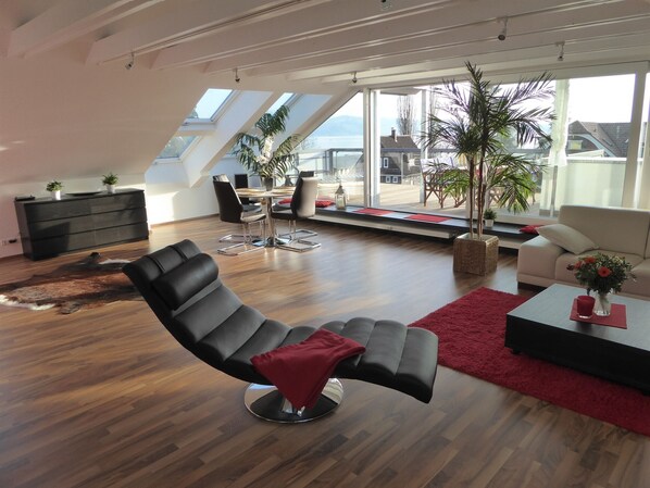 Pros: Wohnzimmer und Terrasse sehr großzügig und modern gestaltet, mit Sicht auf die Alpen und den Bodensee.