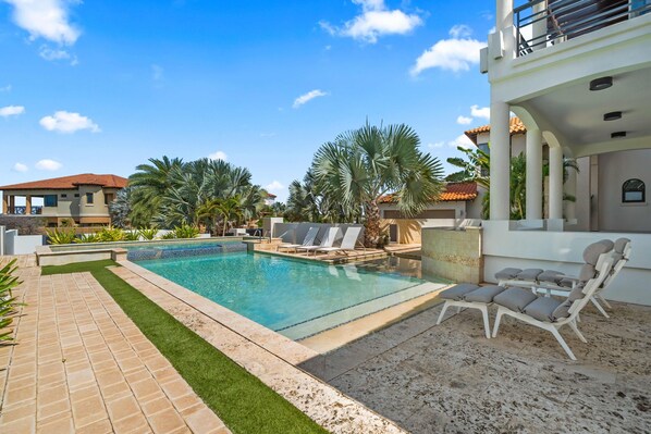 Welcome to a slice of paradise in Aruba, a grand, luxurious villa where every detail has been crafted to create an unforgettable experience. As you approach, a sweeping driveway leads you in, setting the stage for the stunning property that awaits. Just beyond lies a sparkling oasis, a large pool with an attached lap pool, that invites you to dive in or relax at your leisure. Surrounding the water are plush lounge chairs, perfect for unwinding in the warm tropical evenings. An outdoor shower offers a refreshing rinse after a swim, and for culinary delights, the BBQ grill is set up for festive al fresco dining. Little ones can revel in their own adventure on the playground, complete with swings, a slide, and climbing structures that keep young spirits entertained.