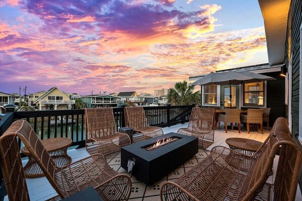 ☀ Back Porch with Fire Pit, Dining Table & Plenty of Seating