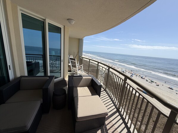 Fabulous, fully furnished, professionally decorated oceanfront , vacation condominium situated in The Mar Vista Grande, a Four Diamond, AAA rated property. This gorgeous unit features 3 bedrooms, 3 full baths. This spacious split plan features a private master suite with walk in closet and balcony access with direct oceanfront views.The master bath features double sinks, hardwood cabinetry, granite counter top, walk-in ceramic tiled shower with seat, whirlpool tub, linen closet, crown moldings and more. The gourmet, fully equipped kitchen has a granite breakfast bar with seating, stainless steel appliances and a full size stacked washer/dryer. Relax in the large sectional sofa or dining area featuring ocean front views, ceiling fans, flat screen TV, cable and wireless internet. The two additional bedrooms are quite large and feature 2 queen beds in each room. This direct oceanfront unit features a spacious balcony with comfortable patio furnishings. The building amenities include heated and cooled enclosed hallways, four high speed elevators, a fifth floor state-of-the-art fitness center, indoor and outdoor pool areas with hot tubs and lazy river, private beach access, seasonal full service Tiki bar, four enclosed levels of parking and one traffic light from Main St. And the Highway 31 connector. Minutes from restaurant row, outlet shopping, world renown golf, water sports, and all the Myrtle Beach area attractions including Barefoot Landing.