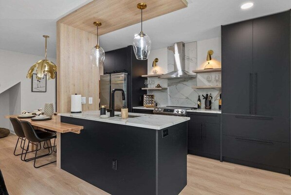 A culinary enthusiast's dream, this fully equipped kitchen features modern appliances and an innovative drop-down island table for communal dining.