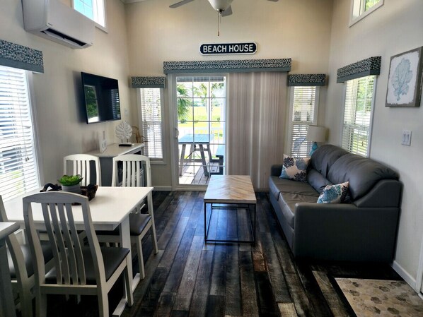 The tiny home is located in Barefoot RV Resort. The resort is a gated community with a splash pad, lazy river, pool, outdoor playground, corn hole, arcade, camp store, bath house, and laundry facility. From the resort, by golf cart, you can access several locations, including but not limited to the beach, Barefoot Landing (a huge outdoor entertainment, shopping, & dining venue), restaurants, grocery store, gas station, etc! Bring your own golf cart or rent one for your stay by calling Salty Frye’s Golf Carts. The resort works exclusively with Salty Frye’s, and they will deliver the golf cart to the tiny home the day of your arrival.