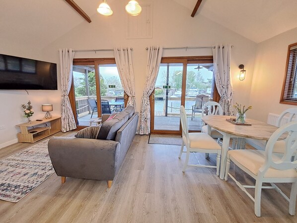 Lounge with Smart TV and dining area with table and chairs for 4 guests. Double French doors lead out to the veranda with dining furniture and steps down to the garden with a picnic table and the waters edge.