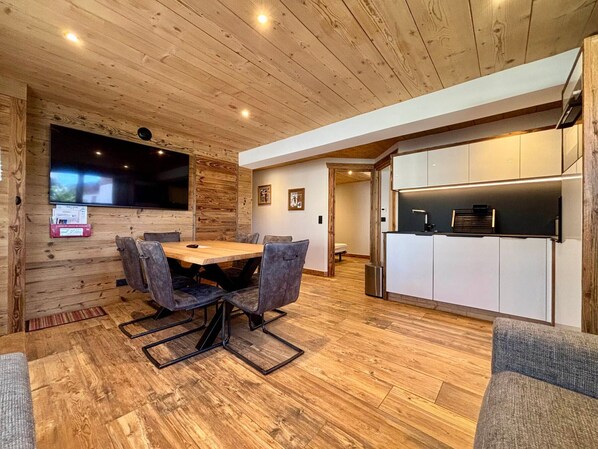 The apartment enjoys a prime location in the village center, just 100 m from shops and restaurants, and 250 m from the Espace Diamant ski slopes and ski school.