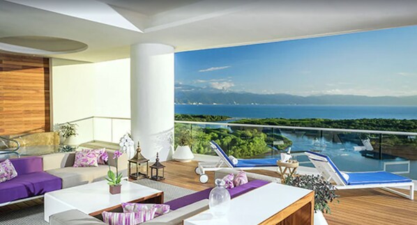 The Grand Luxxe Four Bedroom Residence Suite offers a private sanctuary with a gourmet kitchen and wine bar. Two terraces extend the living space, one with a plunge pool. Guests enjoy massage services, golf access, and entry to the exclusive Beach Club.