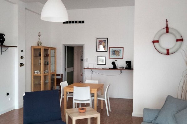 Description: first and last floor of building. Large panoramic living room with double sofa bed, dining table and kitchenette - double bedroom with balcony - bathroom with shower - sea view balcony equipped with dining table - shared garden.