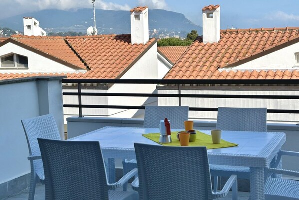 Entrance floor: private and fenced garden - living room with sofa, dining table and kitchenette - double bedroom - bathroom with shower - terrace equipped with umbrella, table and chairs with wonderful views of the sea and the mountain.