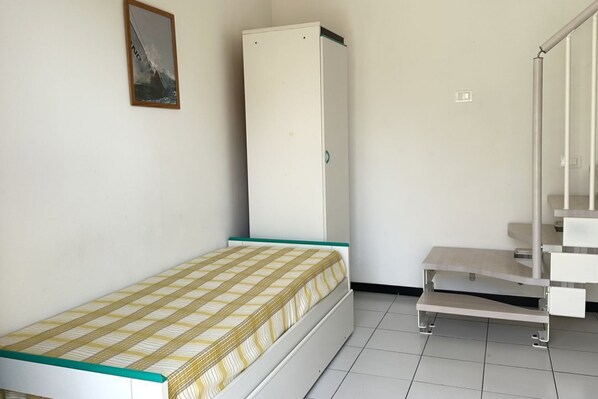 Upper floor: Large mezzanine bedroom with a double bed, a single-door wardrobe, and a chest of drawers.