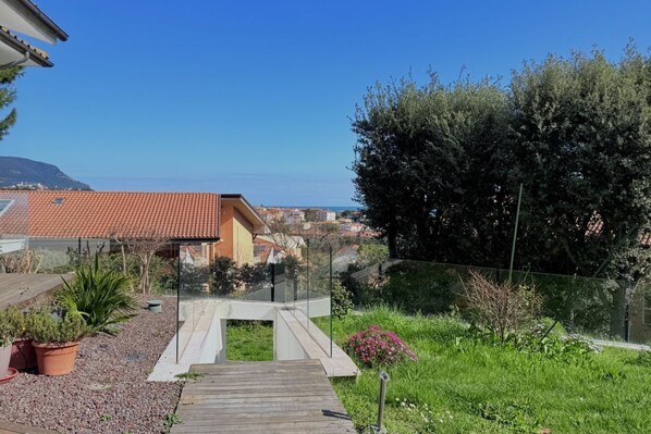 Description: elegant villa on three levels, with independent entrance that leads directly to a large garden with a sea view patio, completely fenced, where you will find a relaxing in-ground tub, a practical outdoor shower and a large parking space with double parking space.