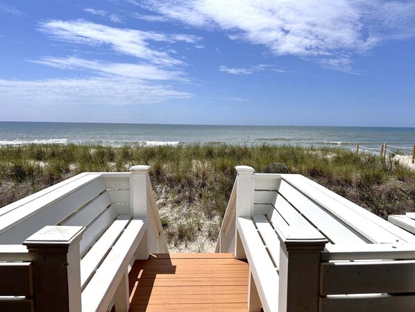 At 1 BLUE OASIS, unwind in a completely remodeled oceanfront home that's perfect for slipping into a simpler time. Enjoy beautiful sunrises and sunsets from nearly every window, private beach access directly in front of the house, and comfortable seating on the covered porch.