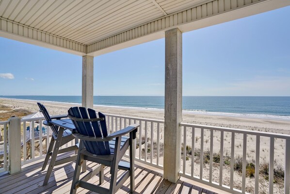 There is a spacious kitchen, large flat-screen TV in each family room, and TVs in all bedrooms. The large oceanfront decks ultimately expand your living space so everyone can spread out and enjoy the scenic views of Oak Island. This home also features an outdoor shower, 2 charcoal grills, wireless internet, expanded HD cable, Smart TVs, ceiling fans, and extended ocean views.