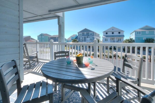 Outdoor dining - Enjoy ocean views at WBV 103 A Stones Throw, a cozy 2BR condo in Oak Island. (Oak Island)