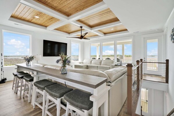 Step into an inviting ambiance that seamlessly blends modern elegance with coastal charm. The living area boasts sweeping views of the ocean, all while providing ample space for relaxation and entertainment. Enjoy lively gatherings in the spacious great room or catch up on your favorite films in the cozy lounge area. Each bedroom is thoughtfully appointed to ensure maximum comfort, with plenty of space to unwind after a day of beach adventures.