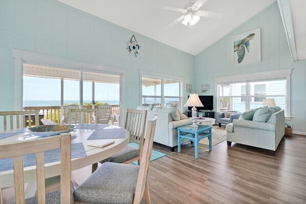 Heron House boasts 6 beautifully appointed bedrooms and 3 bathrooms, accommodating up to 16 guests. The layout includes a luxurious king bedroom, multiple queen and twin bedrooms, and a fun bunk bed setup, ensuring plenty of restful spaces for everyone. The delightful ocean views offer the perfect backdrop, whether you're enjoying a morning cup of coffee or evening sunset.