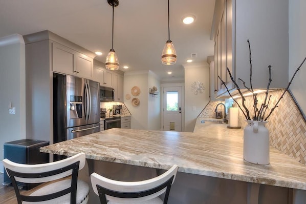 This beautifully appointed three-bedroom home offers an inviting ambiance and comfortably accommodates up to six guests. With two spacious queen bedrooms and a cozy twin bedroom, you'll find a restful haven for everyone.