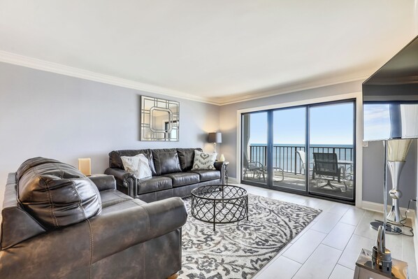 Plaza 808. This fully redesigned Oceanfront, three-bedroom condo awaits you! It boasts a fully equipped kitchen with quartz countertops, stainless steel appliances with wonderful Italian tile throughout. A large kitchen island, kitchen table & a wet bar with wine-cooler are included for easy entertaining. You have a private laundry closet with a full-size front-loading washer/dryer for convenience. All bathrooms are completely renovated with a designer's touch that includes beautiful cabinetry, quartz countertops and glass mosaic tile. This spacious 1650 ft. living area will not disappoint. Entertain family & friends with plenty of room! This spectacular condo has 3 bedrooms and a queen sleeper sofa in the living area. Bedroom 1 - King Bed, Bedroom 2 - 2 queen beds, enclosed den has 2 sets of bunk beds; 2-doubles lower & 2-twins upper. No pets, please. Non-smoking. Maximum occupancy is 11 people, including children.