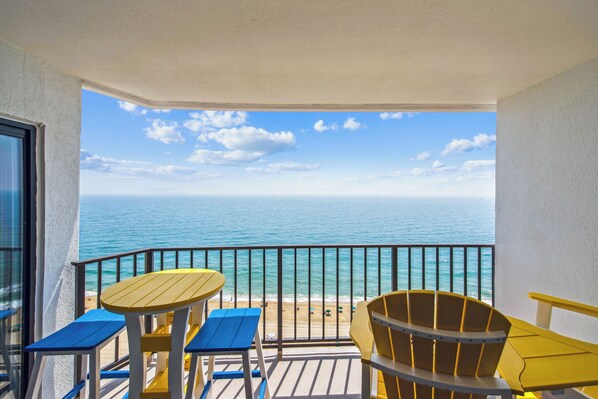 PLAZA 1705 9800 Coastal Hwy. Saturday to Saturday. NON-SMOKING - NO PETS Top floor, newly decorated, updated direct oceanfront, 2 bedroom , 2 bath condo is a favorite vacationer's dream! Top floor, amazing view from the ocean front balcony with access from the living room and your master bedroom with room darkening curtains. Perfect for enjoying the sunrise with your first cup of coffee or watching the stars emerge in the evening while enjoying a cool beverage with the family. This lovely condo has an updated, fully-equipped kitchen with dishwasher and microwave, inviting living room, with large flat screen television for family moving night and beautiful decor with painted murals. The new owners have furnished the condo with new living room furniture, new bar stools, new coffee table, new dishwasher! NEW French Doors installed in washer/dryer entry; reduces noise and super easy to open & close. The master bedroom has all new furniture as of 2022. The bathrooms have been updated, safety grab bars added and there is a built in seat in the master bathroom walk in shower. You will enjoy cool central air, three TVs and three DVD players. There is a stack washer and dryer in the condo. Maximum occupancy 8. BDRM 1: King Bed BDRM 2: Two Double Beds DEN: Queen Sleep Sofa.