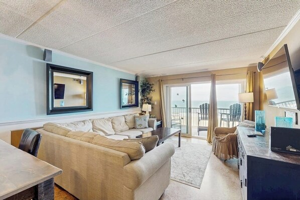 Come relax and make memories in a beautiful oceanfront condo with breathtaking views. The balcony has unobstructed east, north, and south coastal views. The large windows in the primary bedroom are great for sunrises. Spend blissful days by the pool or walk to the beach for days of fun on the shore. Visit the boardwalk for fun and amusements. With a convenient mid-town location, find all the Ocean City favorites within walking distance: Seacrets, Fager's Island, Dumser's, Nick's Mini Golf, and Alley Oops, right across the street, along with the famous Ocean City Boardwalk and outlet shopping just a few minutes away. There is also a grocery outlet nearby, perfect for grabbing ingredients to prepare in the full kitchen during your stay, and delicious restaurants when you feel like dining out. When amazing days are through, settle in front of one of the smart TVs and unwind. The welcoming living room sets the scenes for movie nights. Added perks include complimentary WiFi, central air-conditioning, two parking spaces, luggage carts and helpful kitchen appliances including a Keurig coffee machine and an ice maker.