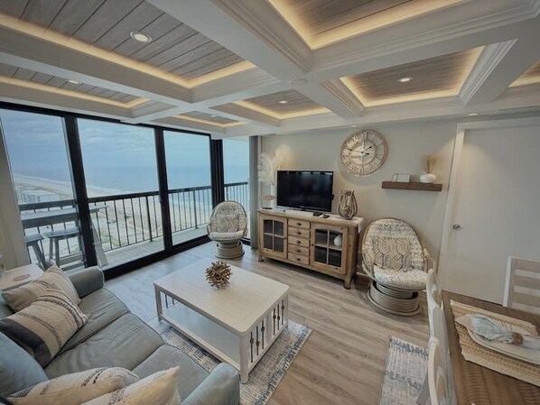 We were pleasantly surprised during our stay at Sea Watch 1705 - the stunning balcony view of the ocean and bay couldn't have been better. The balcony table and chairs were a great spot for morning coffee at sunrise and late-night family games. With WiFi and smart TVs in every room, along with a smart thermostat, multicolored LED lights, dimmers, multicade arcade game machine, and updated appliances, the amenities far exceeded our expectations. Add in the short walk to the beach, indoor/outdoor pools, My Place cafe on site open from breakfast through late-night ice cream runs, the arcade, cinema, EV charging station, and more, there was no shortage of conveniences and fun. The location on 115th is ideal because within walking distance is Dairy Queen, Food Lion, Playa Bowl, Greene Turtle, Fractured Prune donuts, and so much more. The photos in the listing represent the condo well. We will be back!