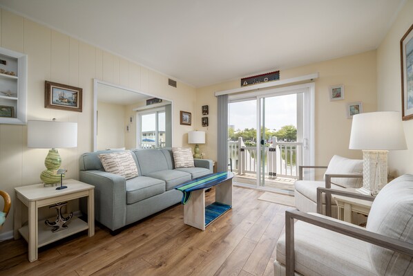 Welcome to Bayshore Estates North. Its time to book your vacation for your family of 8 at this adorable Bayside Canal Condo featuring 3 bedrooms, 2 Baths, lots of deck space for outdoor dining & entertaining. The living room & master bedroom have sliding glass doors with access to the balcony overlooking the canal. Enjoy cooking in the fully equipped kitchen. The living room has a new queen sleeper sofa (2023). The Master Bedroom features a queen bed, private ensuite with stall shower, tv, ceiling fan & private access to balcony. The 2nd Bedroom offers a queen bed & ceiling fan. The 3 bedroom has a full bed & ceiling fan. The hall bath has a tub/shower combo. There is a washer & dryer, streaming tv ( HBO Max, Netflix, Youtube) & complimentary wifi for your added convenience. Boat slip will accommodate a 22 foot boat. Hose available for boat cleaning. 1 assigned parking spot & one shared parking spot on a first come, first serve basis. Property rents any 7 nights in season and any 3 nights off season.