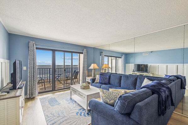 PLAZA 512 is a direct oceanfront haven with 2 bedrooms, 2 baths, and semi-private den. Unwind on the balcony with breathtaking ocean views or enjoy the fully equipped kitchen and central air. The condo features new hardwood floors, granite countertops in the kitchen, Keurig coffee maker for your morning brews.