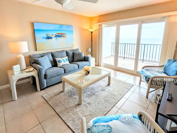 The fully equipped kitchen has all the essentials needed to prepare your meals including a brand-new refrigerator and stove, a dishwasher, microwave, coffeemaker, (Keurig, and a French Press), and washer and dryer. The tile-floored kitchen is complete with a large countertop, barstool seating for four and a brand-new dining table with six chairs. The living room features tile flooring, a brand new convertible queen sofa and area rug , new French doors, ceiling fan, and a new LG Smart 50-inch TV for your enjoyment. The main bedroom offers a queen bed with brand new mattress, TV, brand new LVP flooring, ceiling fan, access to the balcony and spectacular ocean views with a new French door. The large, second bedroom features a new queen size bed, ceiling fan, brand new LVP floors, and a TV for your enjoyment. Both bathrooms are gorgeous and have been recently renovated with spa like oversized step in showers with grab bars. There is central air throughout and free WIFI for the guests.