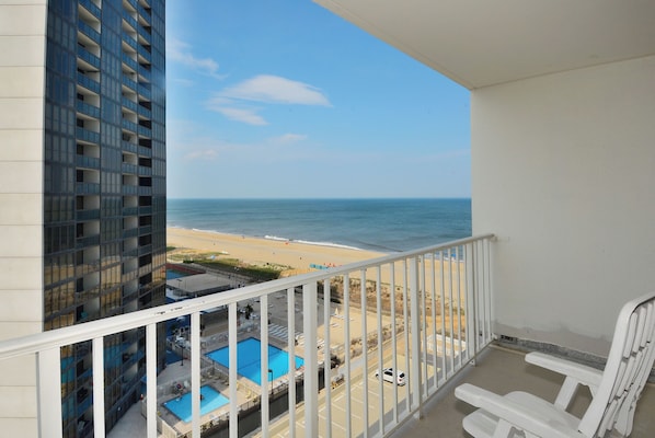 We were two couples that shared this unit. Pleanty of room. Kitchen had everything we needed. Unit very clean. Great view of ocean, right on beach. Building nice but indoor pool not so great. Was cold and small. Beds were hard for our taste but that is personal preference. DVD player not hooked up so didn't work. We stayed 6 days had some bad weather but still had a great time!