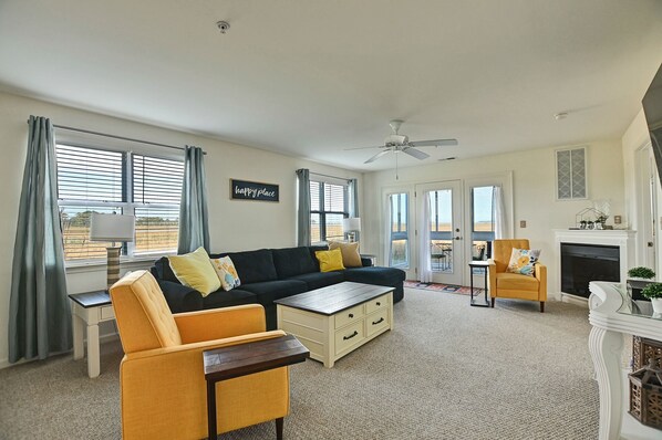 Outdoor & Extras: The unit is surrounded by expansive community green space and features access to bikes, beach chairs, and a beach cart for guest use. The community offers a seasonal outdoor pool, playground, sports courts, and a nine-hole golf course (available for purchase).