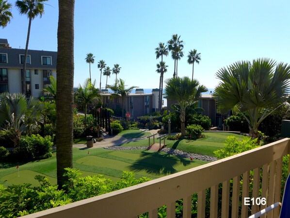Inquire on longer stay discounted rates. E-106 at North Coast Village is a 1BR condo which is located up near the oceanfront and very conveniently located to the beach. It's decorated in beachy and nautical decor. This one bedroom south facing unit boasts ocean and pool views, as well as overlooking the beautifully landscaped gardens and swimming pool. Facing south, it enjoys day-long warm sunshine in both winter and summer; gentle breezes caress at sunset and the gentle sound of surf will accompany your dreams. Kitchen and living room area remodeled in 2024. New stainless appliances and tile floor. Bedroom is carpeted. 2 TVs (living room TV has premium cable channels) and complementary secured WIFI provided. Fresh clean crisp linens are also provided for your comfort.