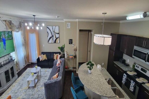 The charming living room is perfect for relaxation, featuring two comfortable sofa beds that can accommodate extra guests. The seating area is complemented by tasteful decor, a large flat-screen 75inch TV, and modern lighting fixtures, creating a cozy atmosphere for movie nights or social gatherings. A dedicated workspace with a desk and chair is also available for those who need to catch up on work or study. Kitchen: