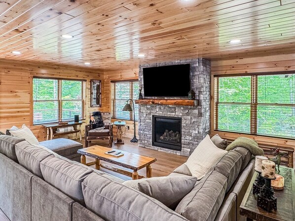 Highland Hideaway is a newly built 5-bedroom, 3-bathroom vacation rental cabin tucked into the woods of Old Forge, NY. Designed with a blend of rustic charm and modern comforts, this spacious Adirondack retreat is perfect for families, friends, and outdoor adventurers looking to enjoy all four seasons. Just minutes from downtown Old Forge, the property offers easy access to snowmobile trails, lakes, hiking paths, and everything the Adirondacks are known for. Inside, the main level features an open-concept layout with a gourmet kitchen, a large dining area, and a cozy great room with a floor-to-ceiling propane stone fireplace and Smart TV. Sliding glass doors lead to a private deck with a propane grill and outdoor seating—ideal for summer cookouts or morning coffee. This floor also includes two queen bedrooms and a full bathroom. Upstairs, you'll find two more guest bedrooms—one with a king bed and another with both a king and queen bed—as well as another full bathroom. The lower level offers a fifth bedroom with a full-over-queen bunk bed, a third full bath, a laundry room, and a large mudroom for storing outdoor gear. Guests love gathering around the outdoor firepit in the evenings, surrounded by towering trees and peaceful forest views. The home also includes central air conditioning, high-speed WiFi, and fresh linens with every stay. This home comes with access to the Hollywood Hills Beach Association which is just a short drive away- perfect for making the most of the area's outdoor recreation. For larger groups, consider booking Pawnee Peak, the sister property located right next door, which can be rented in conjunction with Highland Hideaway. Whether you’re visiting for a snowy adventure, lake days, fall foliage, or a cozy winter escape, Highland Hideaway is your ideal basecamp for experiencing the best of Old Forge and the Adirondacks.