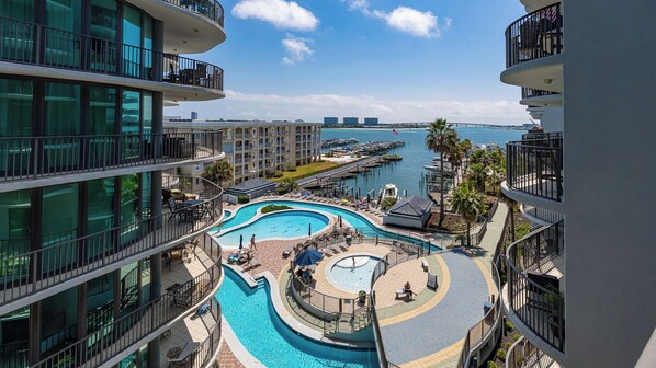 Step outside onto your private balcony and be mesmerized by the breathtaking views of Terry Cove, Robinson Island, and the lazy river. Relax in comfort with ample seating, including a table and chairs, and an additional chaise lounge, the perfect spot to savor morning coffee or enjoy cocktails at sunset.
